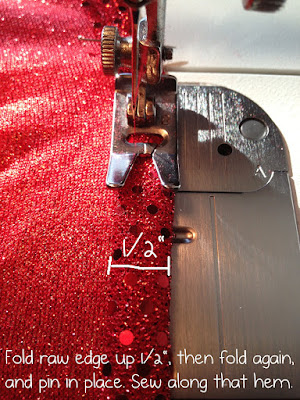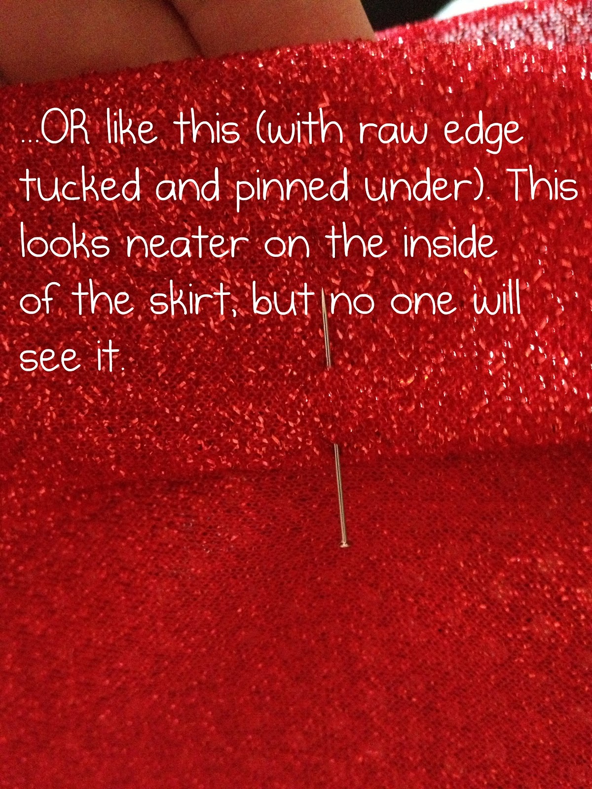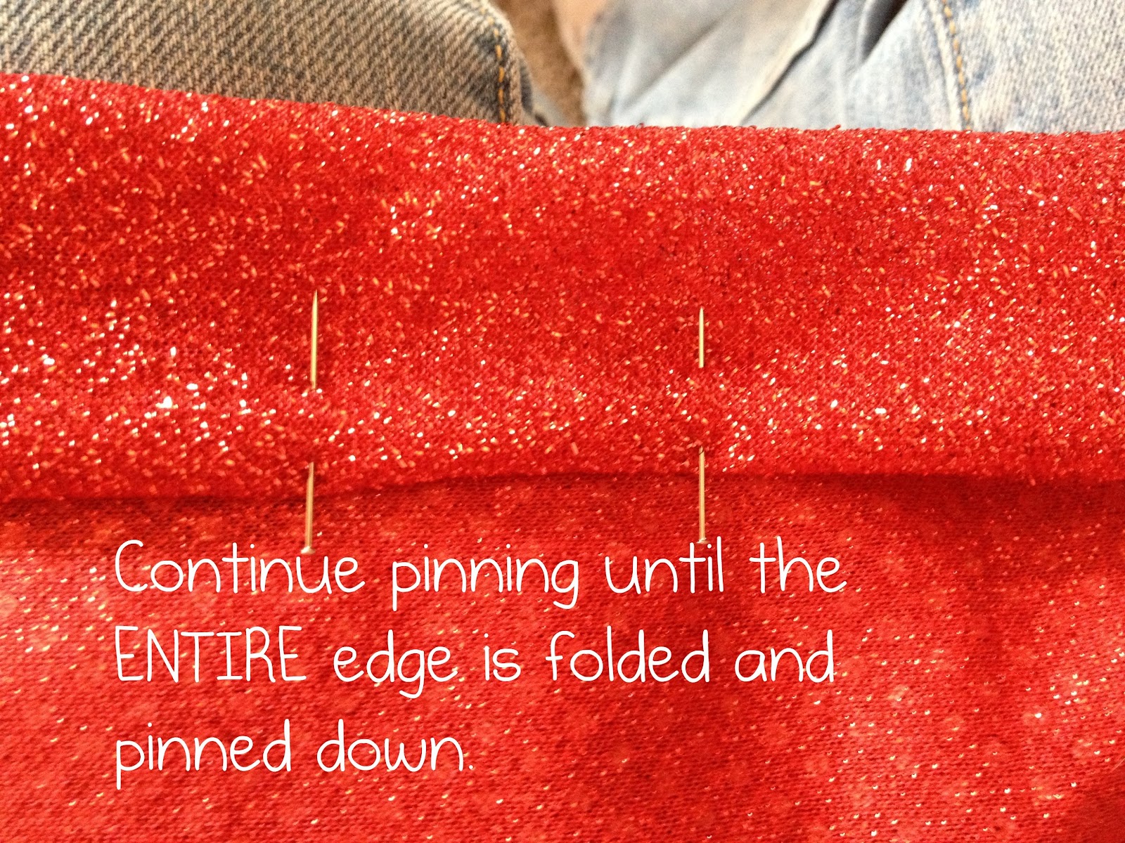 | Fold the raw edge up 1/2 inch, and then fold it again so that it's a nice, neat hem of 1/2 inch. Pin it down like this around the entire skirt, and then sew. |