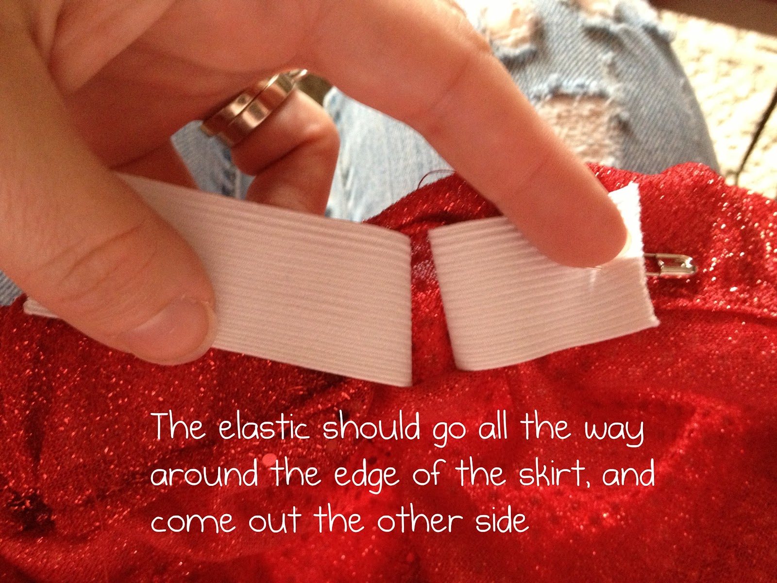 | Sew elastic together and then stretch out the skirt so that the elastic gets swallowed up inside of the tunnel. |