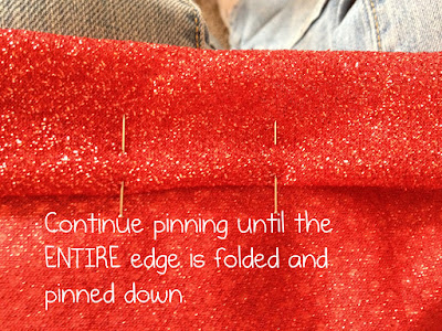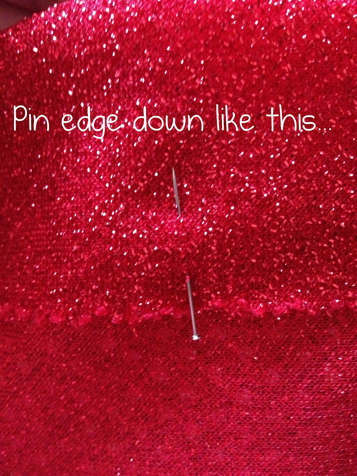 | With right side out, fold along the sparkle line and pin it down as you go (see next picture) |