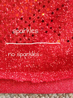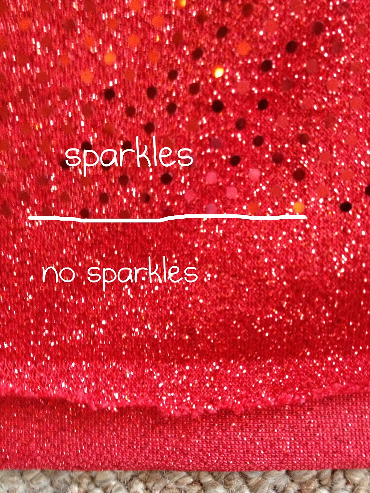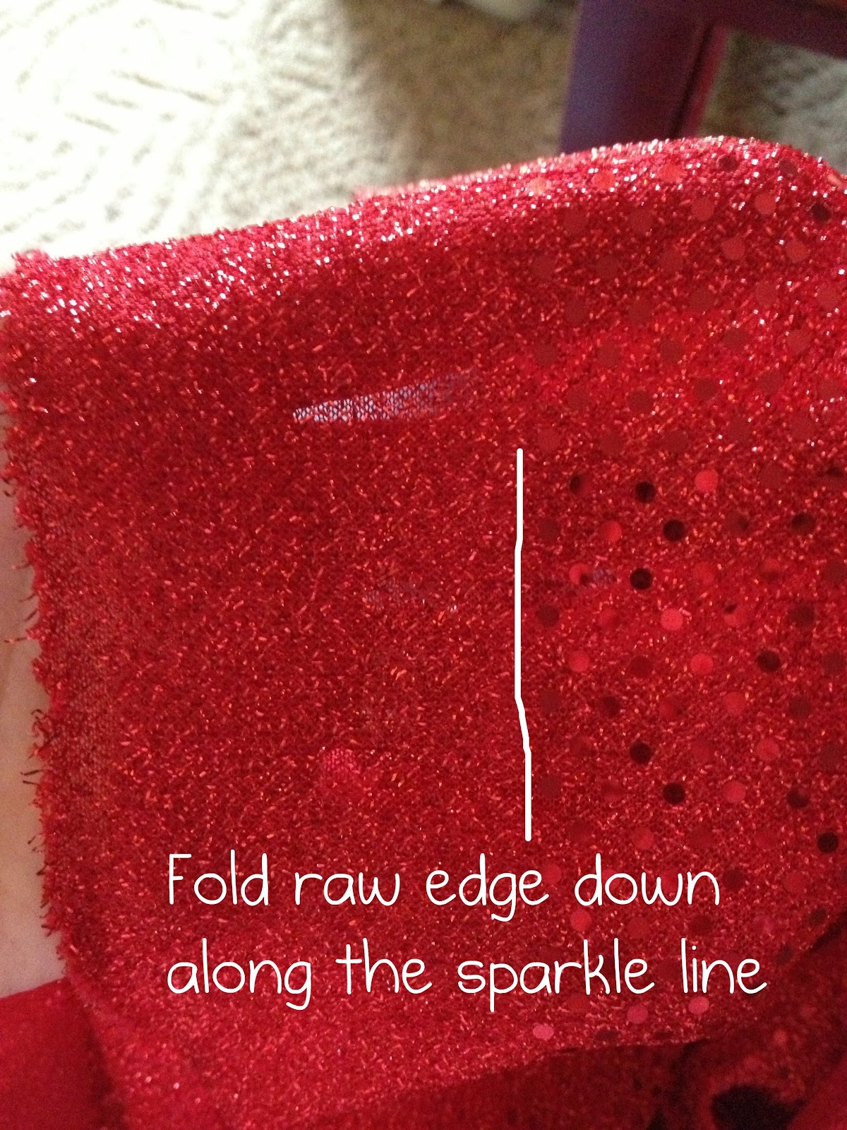 | The edge of the fabric looks like this (the sparkles start a couple of inches from the raw edge) This will become the waistband of your skirt. |
