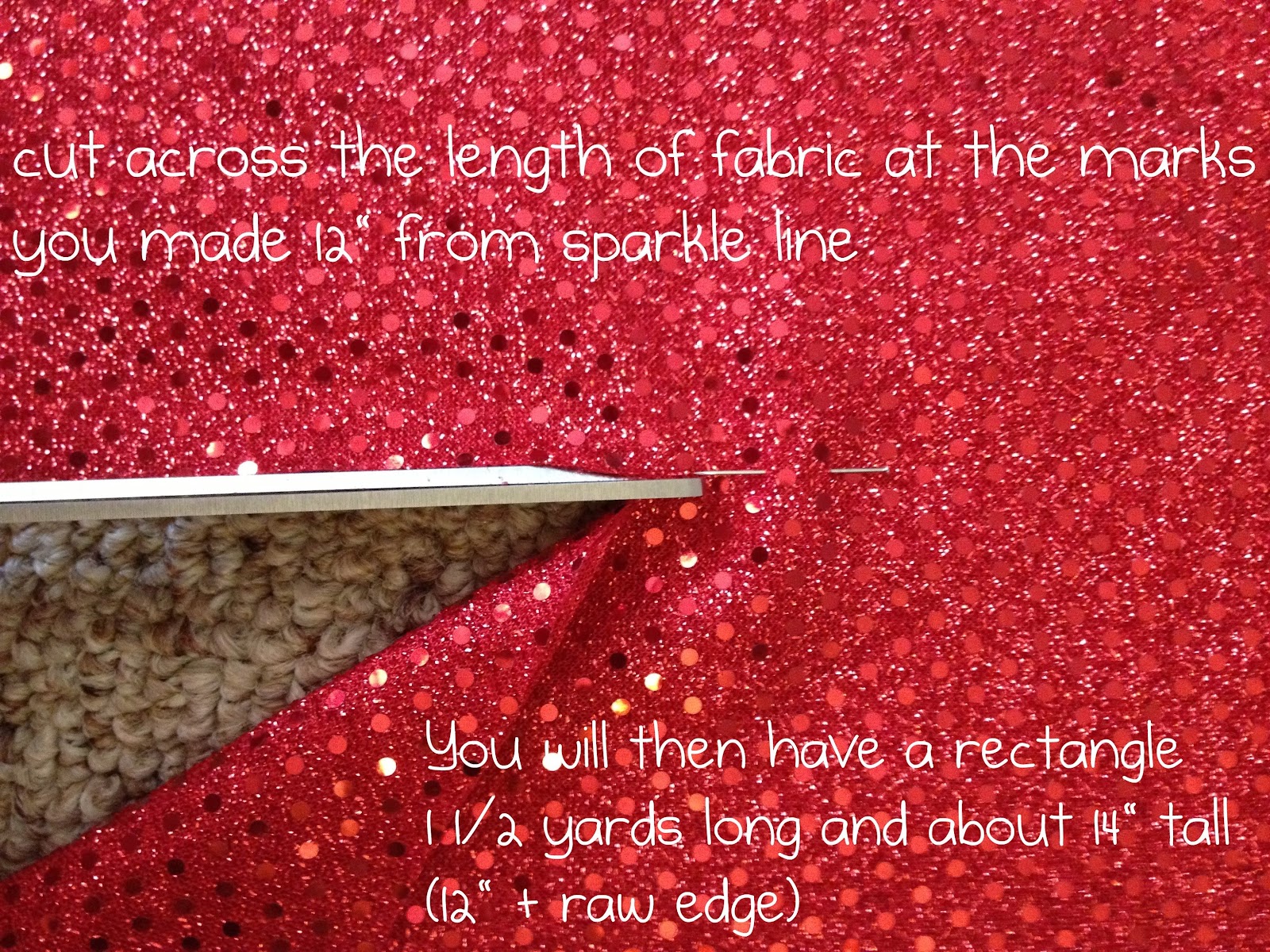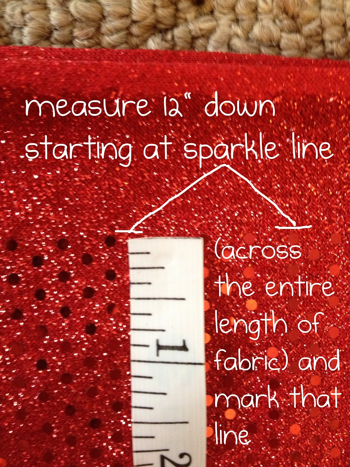 | Measure down 12 inches from the sparkle line across the entire 1.5 yards of fabric and mark with a pin or fabric marker. |